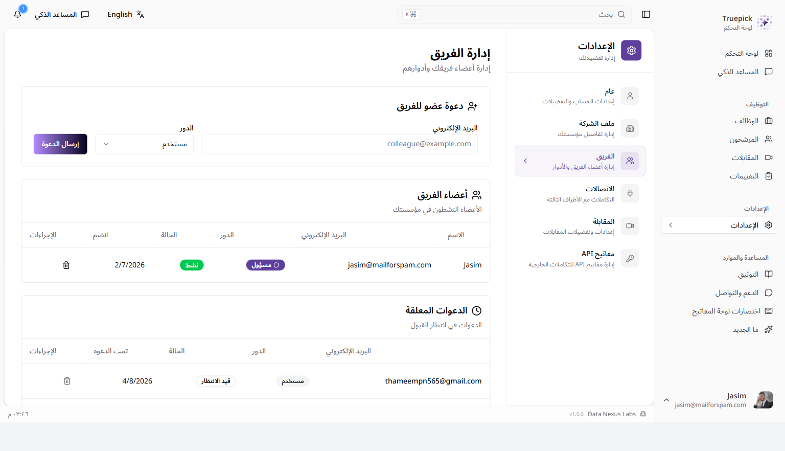 Team Management page in Arabic with full right-to-left layout and properly mirrored interface