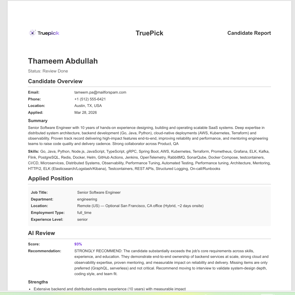 Each candidate's three-dot menu now has a Download Report button that generates a comprehensive PDF for that specific candidate. The PDF also includes a link to a private online AI Review page for deeper inspection.