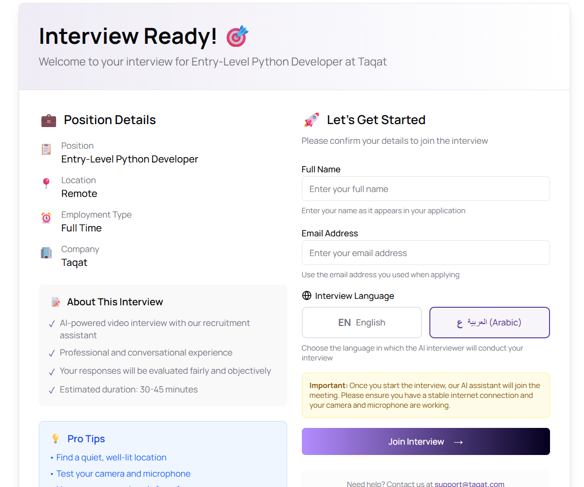 Candidates can now choose between Arabic and English before starting their AI interview. The AI interviewer then conducts the entire session — greeting, questions, and follow-ups — in the chosen language from the very first word.