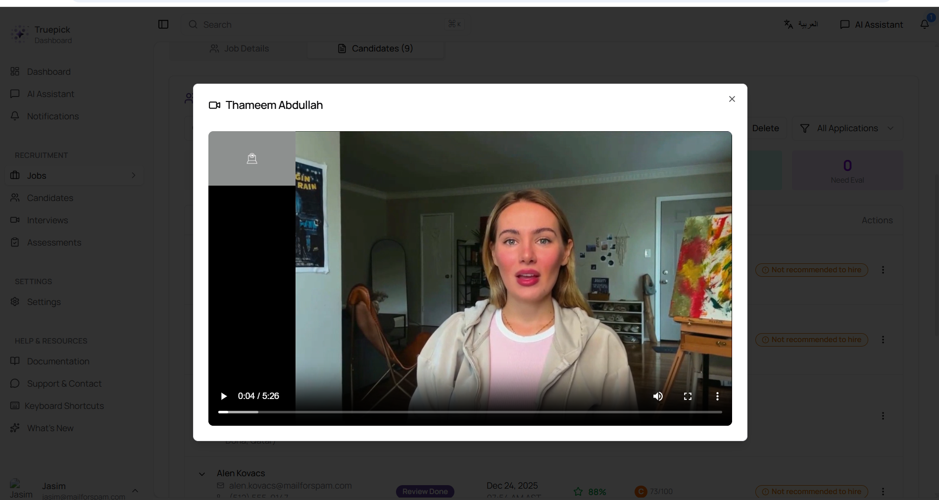 After an AI interview is completed, recruiters can now watch the recording directly within the candidate's action menu — no downloads, no external tabs, no extra links.