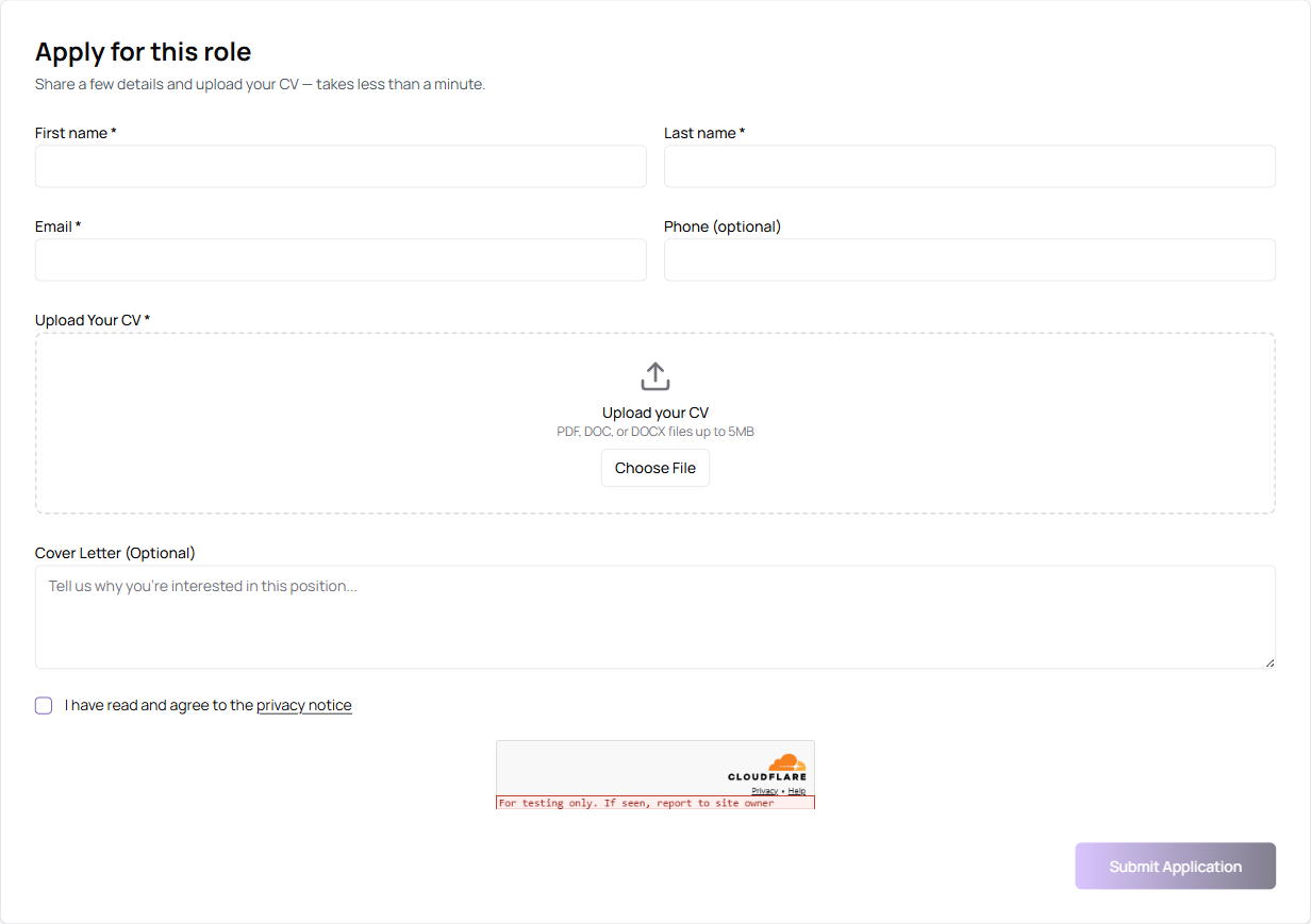 3. Fills in name, email, optional phone, uploads a CV, optionally writes a cover letter