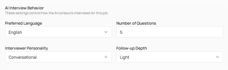 Per-job AI Interview Behavior section — preferred language, number of questions, interviewer personality, and follow-up depth
