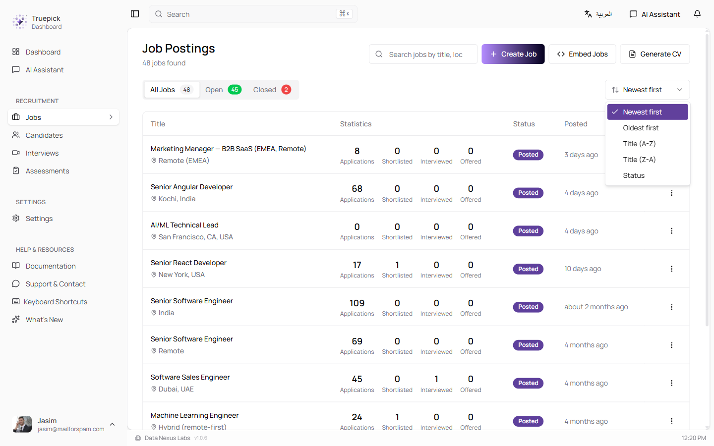 The Job Postings page now has a sort control with five options: