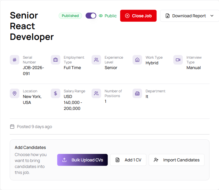 Recruiters can now upload a new CV for an existing application — useful when a candidate sends an updated resume or when the initial upload was the wrong file. The system re-runs AI screening against the job, updates the match score, and archives the previous evaluation so you can see how the candidate's match has changed.