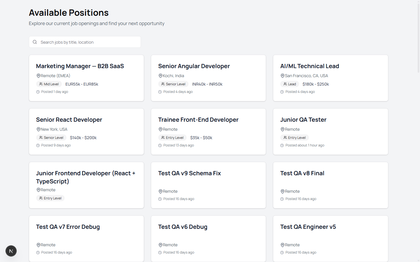 Public job board showing all open positions with search by title or location