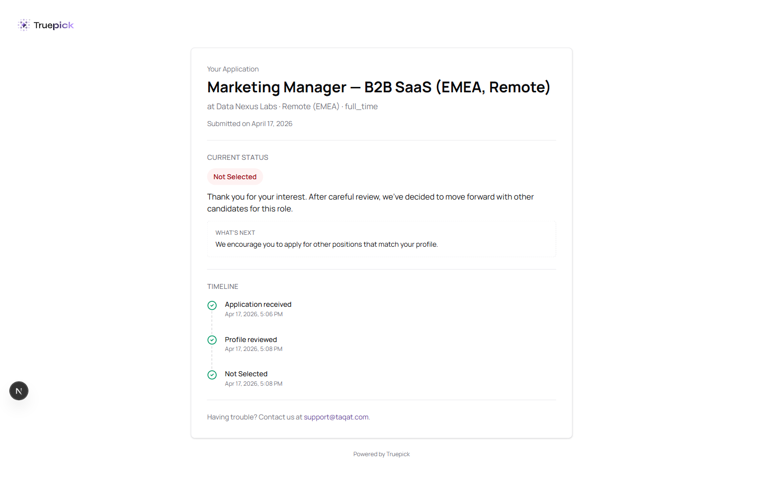 After every confirmed application, Truepick emails the candidate a secure magic tracking link. One click opens a personalised status page that stays current as the recruiter moves the candidate through the pipeline.
