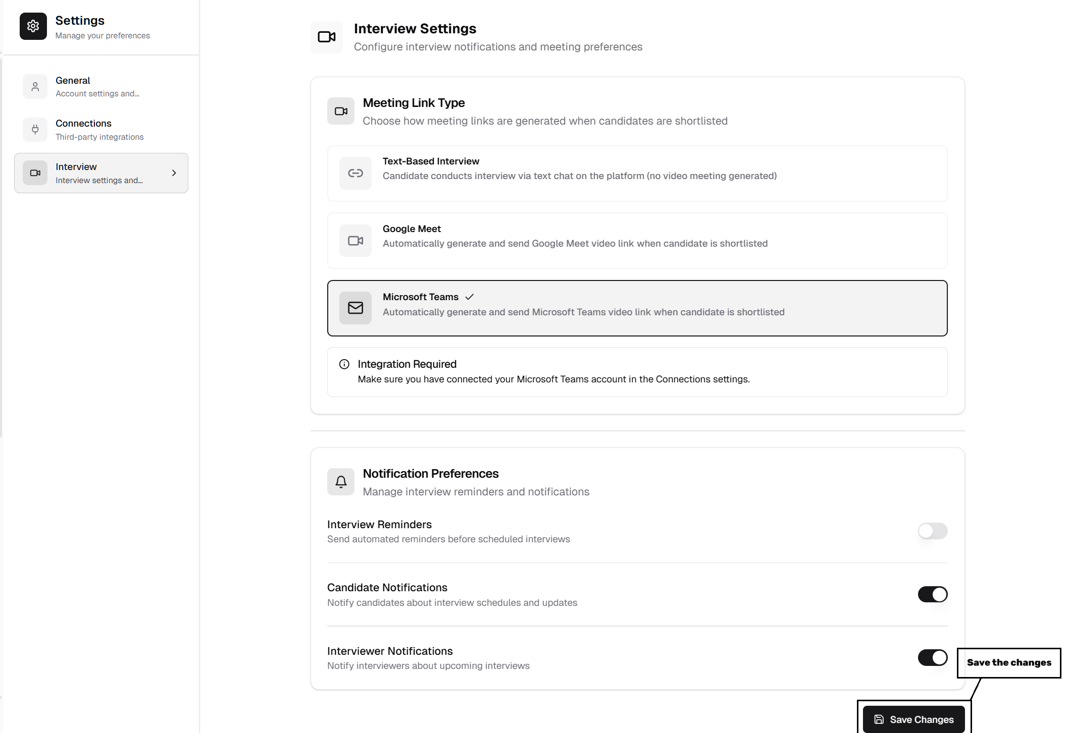 Select your preferred Meeting Link Type in Interview Settings and make sure you save it