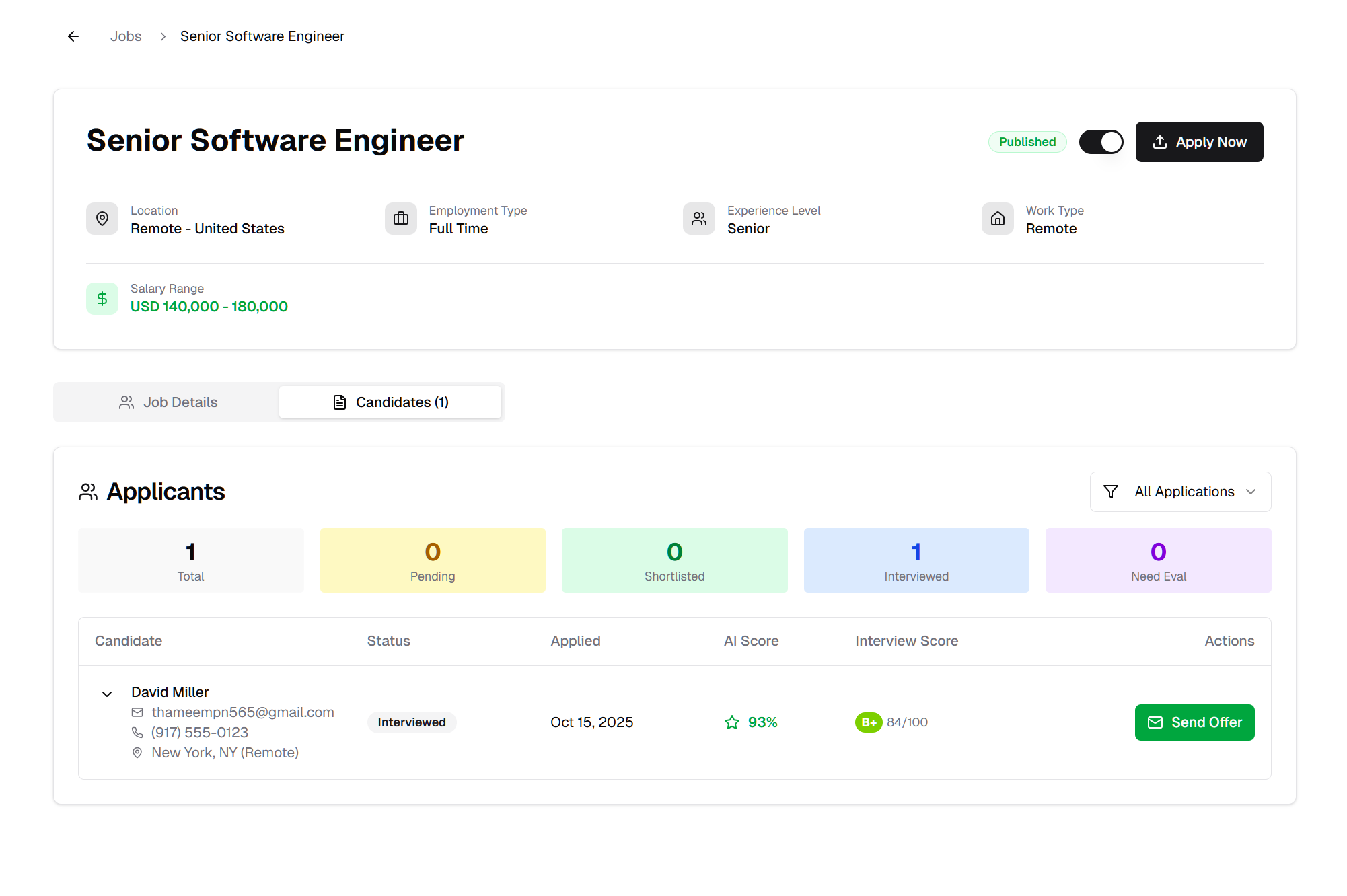 Click "Send Offer" button in the Applicants section