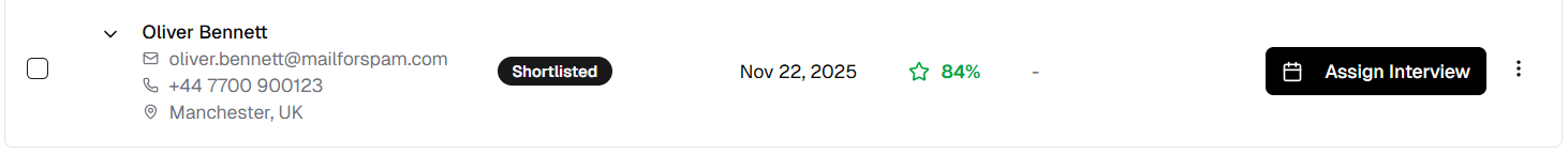 3. Shortlisted candidates show "Assign Interview" button