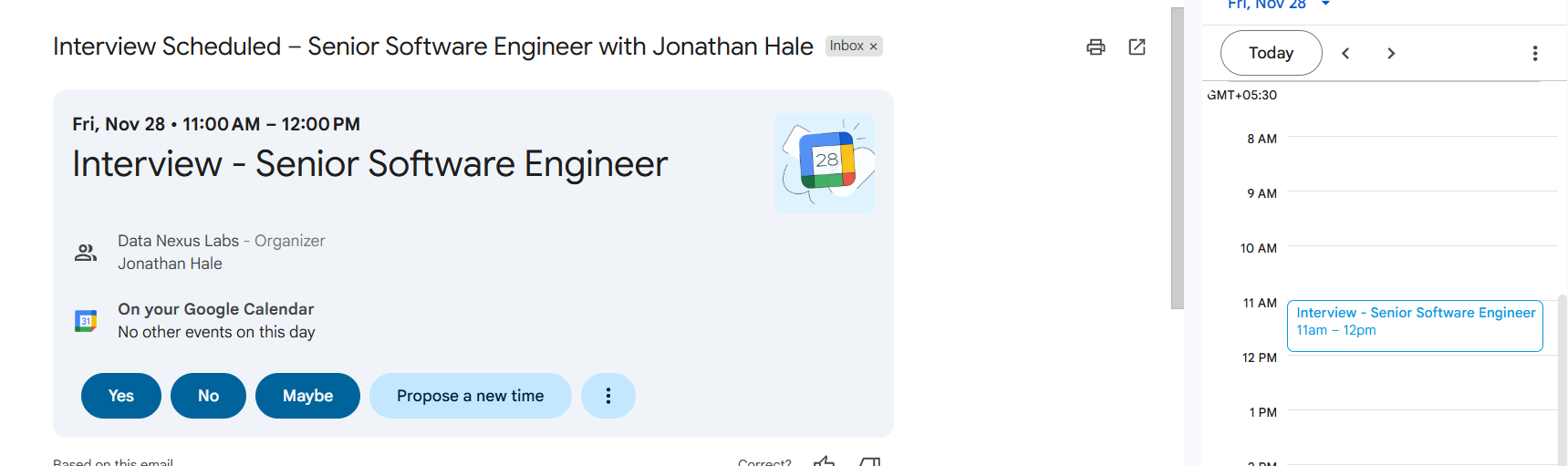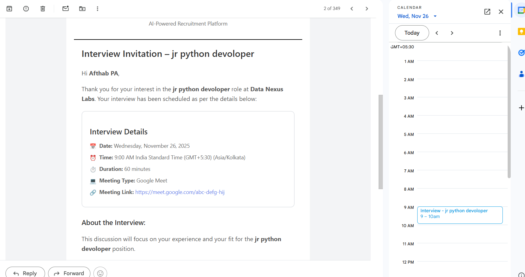 Professional email invitation sent to candidate