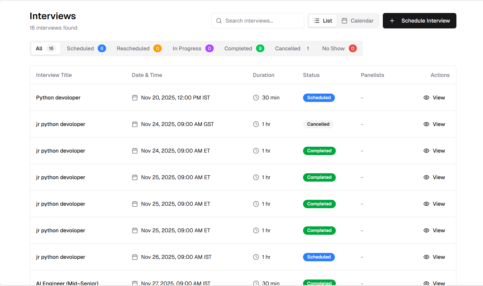 View and manage all scheduled interviews in one organized list.